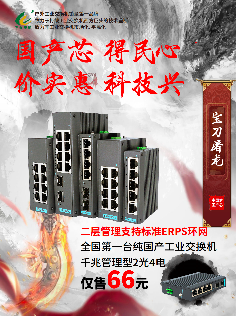 宇航工業(yè)交換機(jī)全國(guó)產(chǎn)管理型千兆2光4電工業(yè)級(jí)交換機(jī)是全球第一臺(tái)100%全國(guó)產(chǎn)工業(yè)級(jí)管理型交換機(jī),其重要意義不言而喻。宇航率先邁出全國(guó)產(chǎn)的第一步,這是充滿勇氣和智慧的一步。宇航工業(yè)交換機(jī)張總表示:“作為一個(gè)企業(yè)要有自己的使命和擔(dān)當(dāng),助力祖國(guó)繁榮富強(qiáng)就是宇航的使命和擔(dān)當(dāng)。為了以后我們不再受美國(guó)對(duì)我們芯片的打壓,這一步宇航必須要走,我們不怕別人打壓我們,就算被打壓也要堅(jiān)持做下去。”