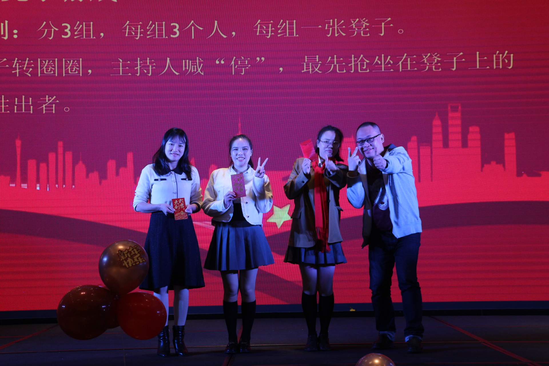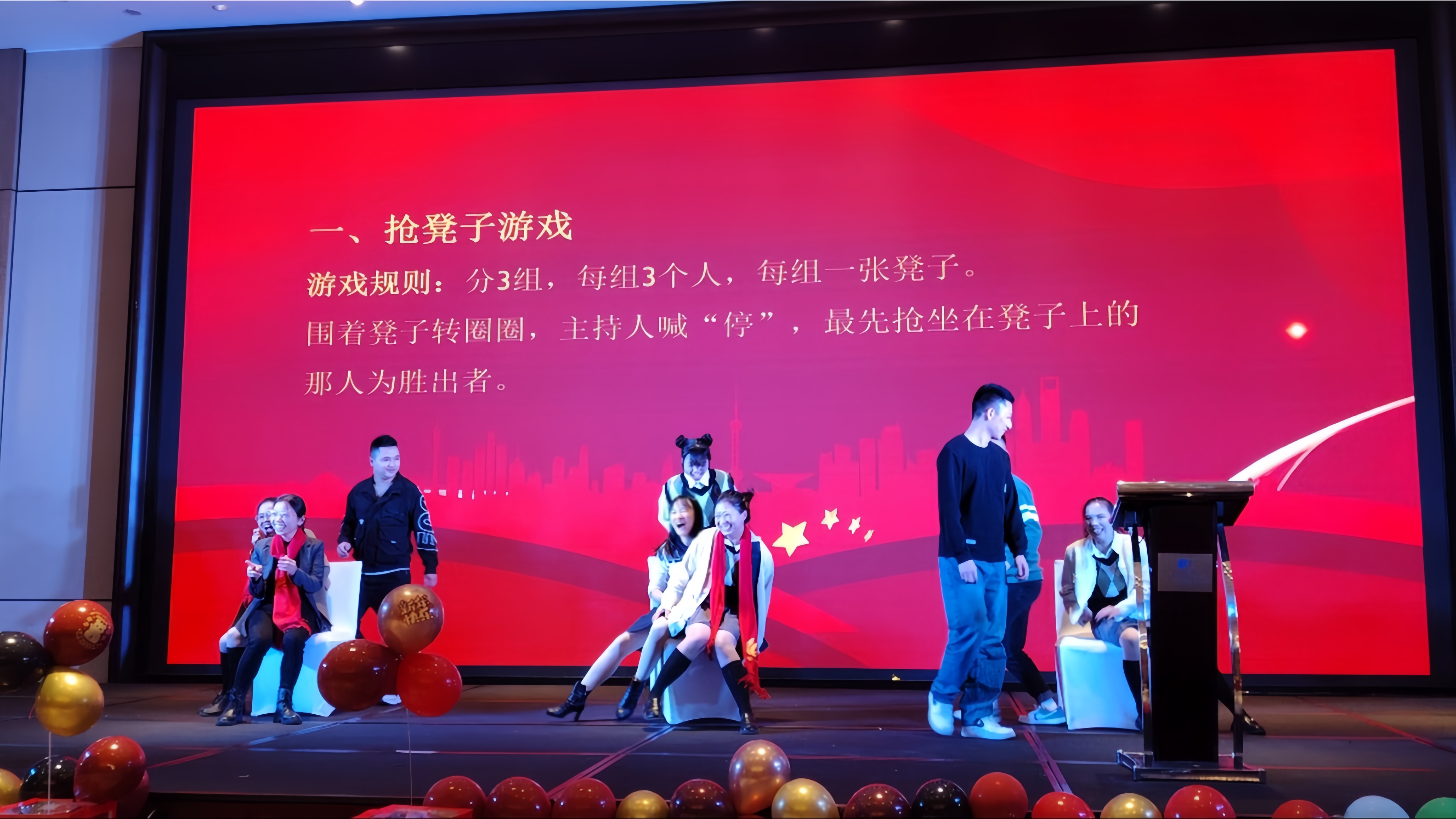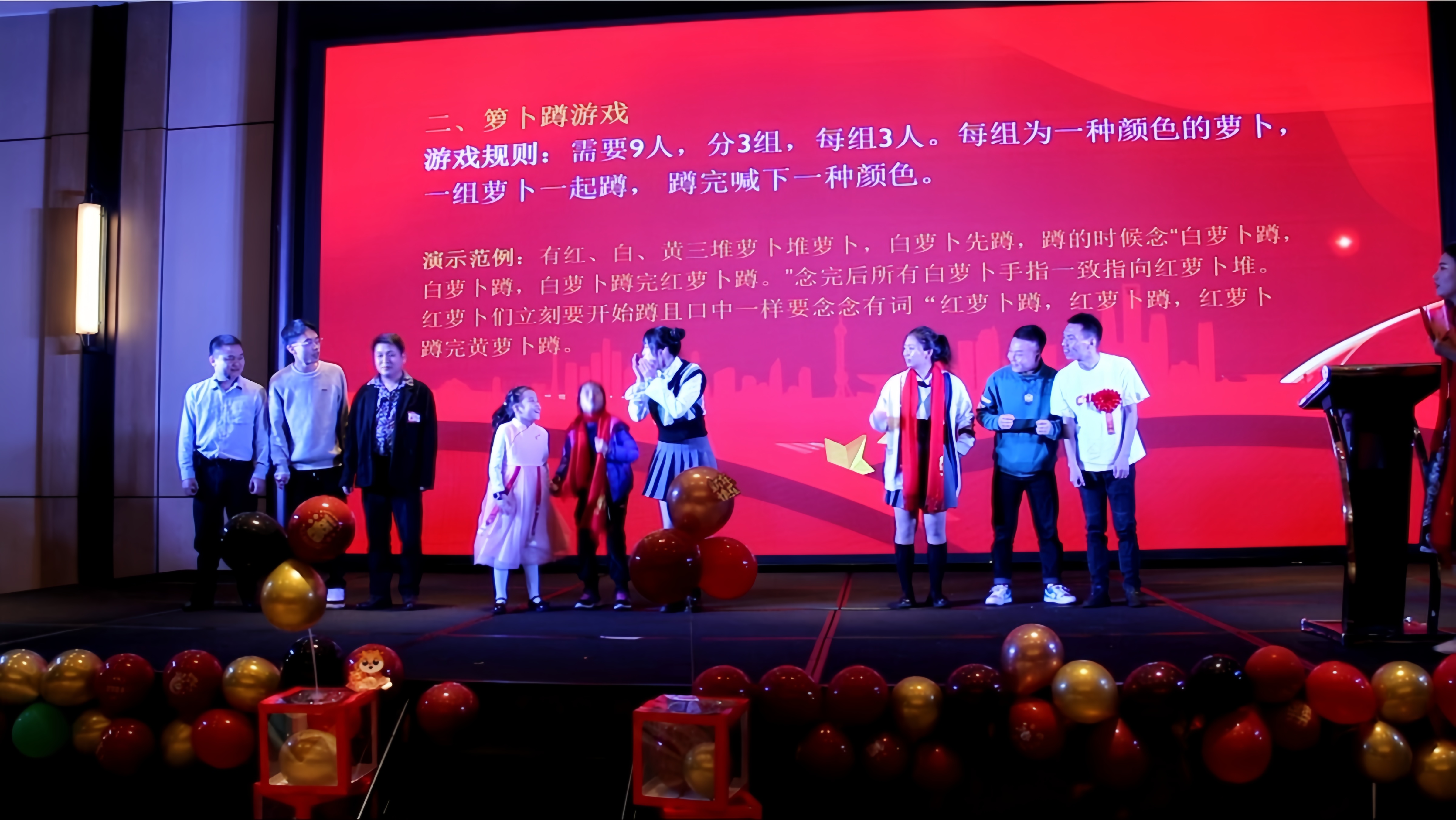 在年會的歡樂氛圍中,還有兩個充滿趣味性的游戲——搶凳子和蘿卜蹲。隨著歡快的音樂聲響起,搶凳子游戲正式開始,參與者們圍繞著凳子轉圈,眼睛緊盯著凳子,耳朵聆聽著主持的口令,當音樂突然停止時,他們需要迅速找到一個凳子坐下。一時間,現場充滿了歡笑聲和緊張的氣氛。緊接著是充滿趣味性的蘿卜蹲游戲,參與者們展現出活力的身姿。他們根據指定的口號,一蹦一跳地輪流蹲下起立,仿佛一群活潑的蘿卜在舞動。在這個游戲中,不僅鍛煉了身體協調能力,還考驗著團隊之間的默契。