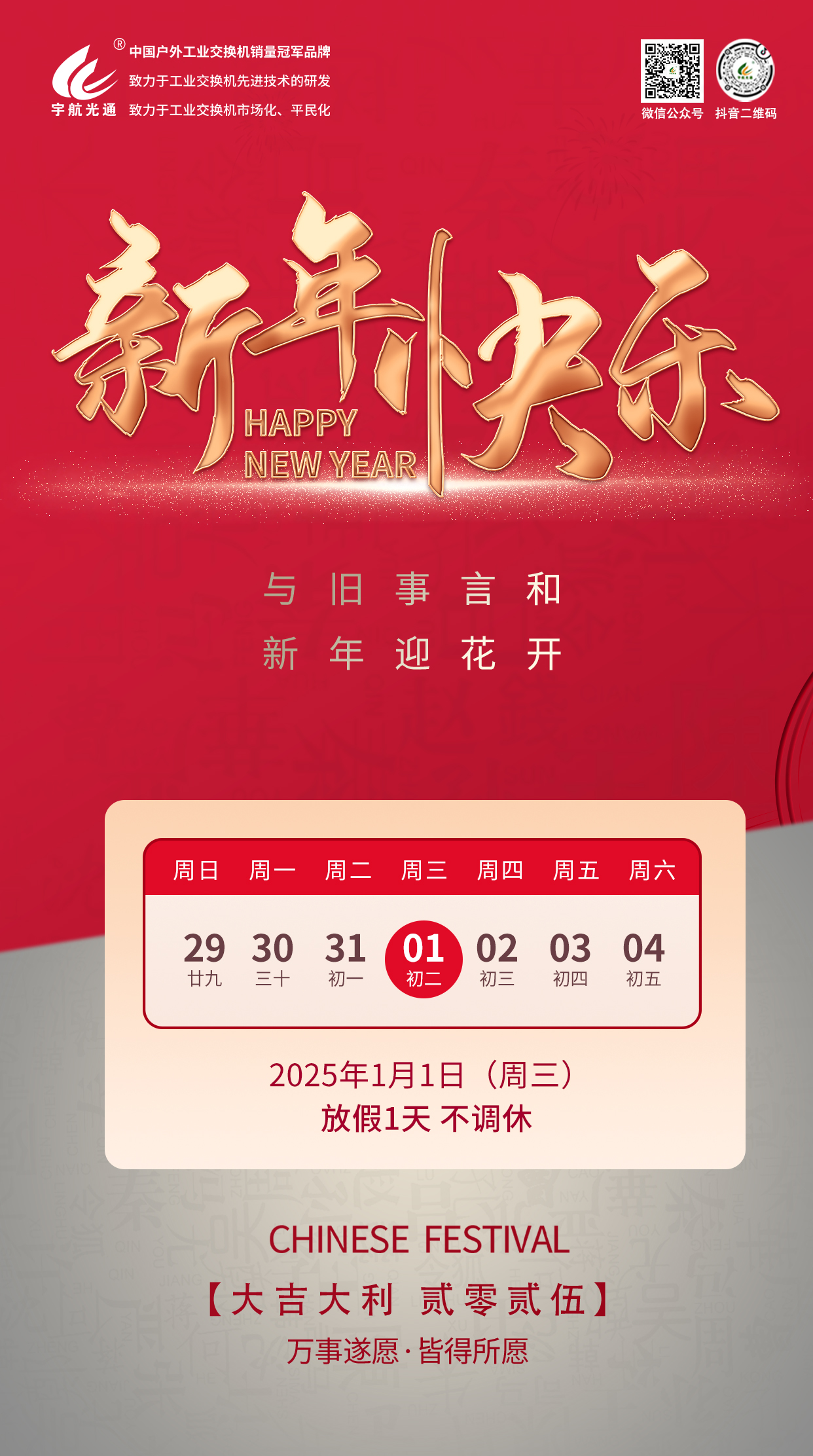 辭舊納新,共赴新程,預(yù)祝大家新年快樂。元旦放假時(shí)間:2025年1月1日(星期三),放假1天。