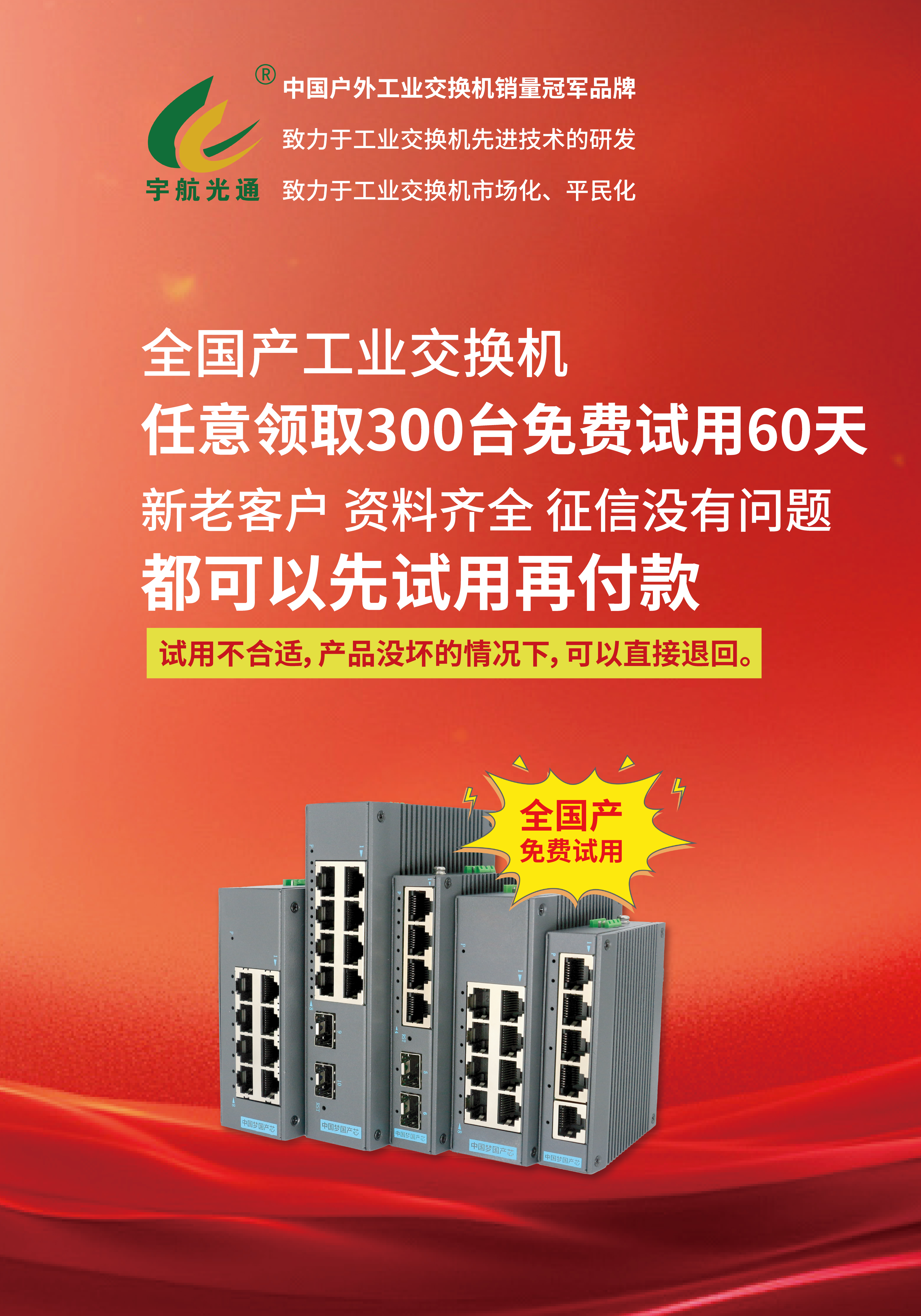 全國產化并非一企之力可成,而是產業鏈協同創新的成果。宇航工業交換機積極聯合國產芯片廠商、上下游伙伴,構建自主可控的工業通信生態。2024年,我們啟動“星火計劃”:面向新老客戶提供300臺全國產交換機免費體驗60天,滿意后付款,不滿意無條件退貨。我們堅信,唯有讓市場看見國產設備的真實價值,才能加速替代進程,共贏未來。