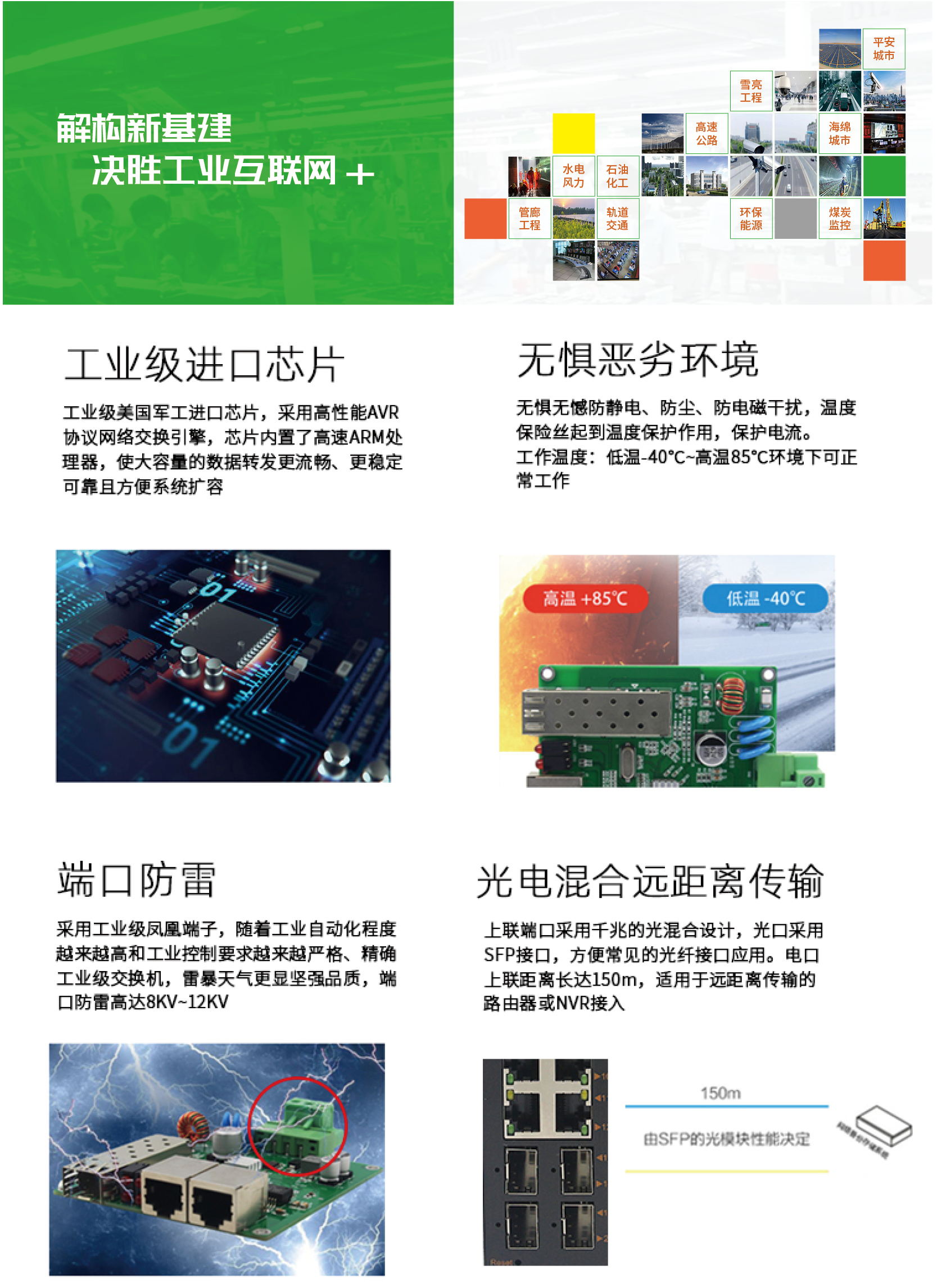 | 采用工業級元器件,具有防雷、防過壓、防浪涌設計,雙電源輸入,保證在不良自然天氣及電壓不穩環境下網絡的正常運行。 | |
