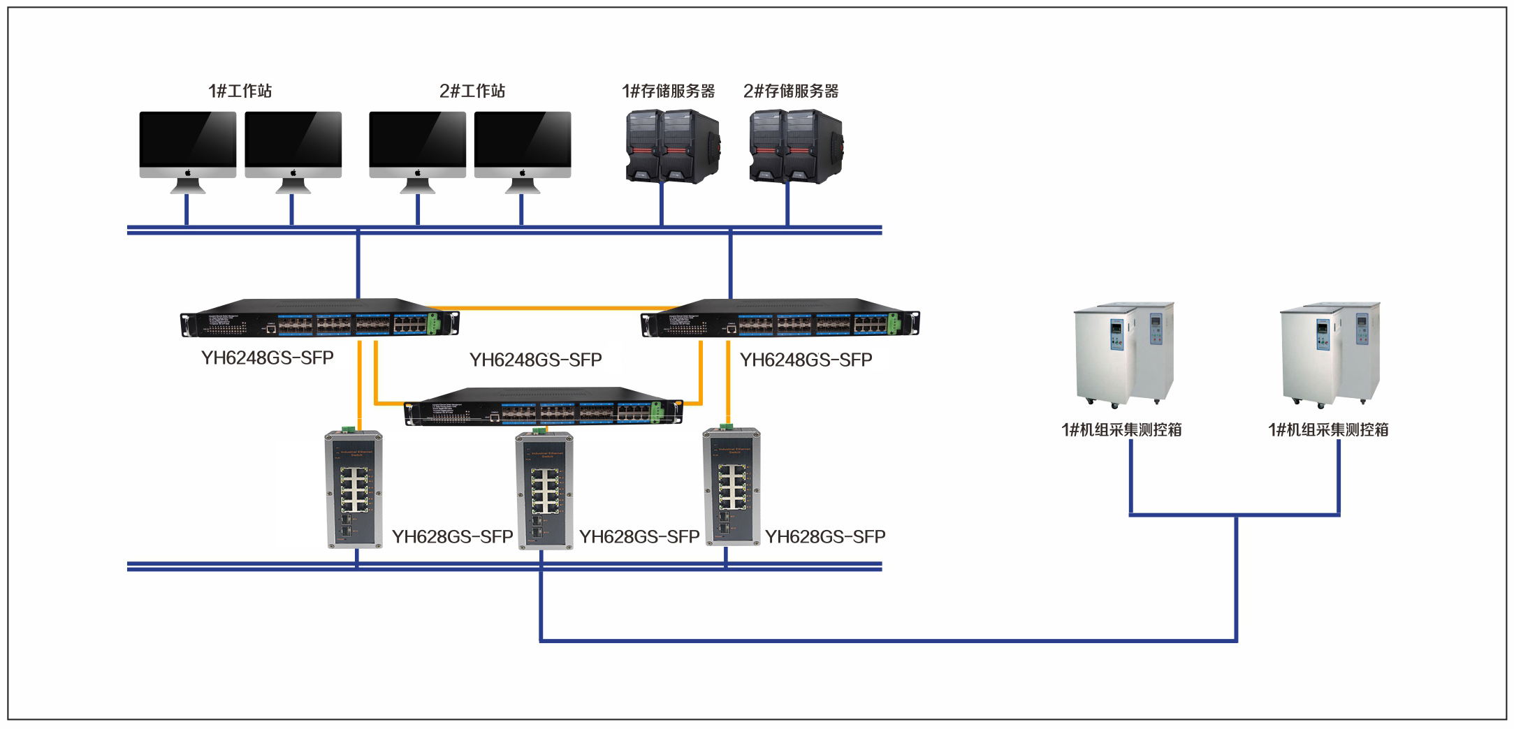 宇航在發(fā)電站集散監(jiān)控系統(tǒng)解決方案中采用了YH6248GS-SFP,YH628GS-SFP.現(xiàn)場數(shù)據(jù)接入層,通過一個接口轉(zhuǎn)換服務器在DCS的I/O層上,可將現(xiàn)場數(shù)據(jù)信息映射成DCS的I/O總線上的數(shù)據(jù)信息,使DCS控制統(tǒng)一集成。數(shù)據(jù)通信層采用主控制系統(tǒng)1#2機組成的冗余環(huán)網(wǎng)信息,上行通過宇航千兆工業(yè)以太網(wǎng)交換機連接工作站,工程師站以及服務器等,下行通過千兆以太網(wǎng)交換機YH628GS連接控制管理主機站等,實現(xiàn)整個系統(tǒng)的冗余結(jié)構(gòu),包裝數(shù)據(jù)傳輸?shù)目煽啃裕€(wěn)定性。