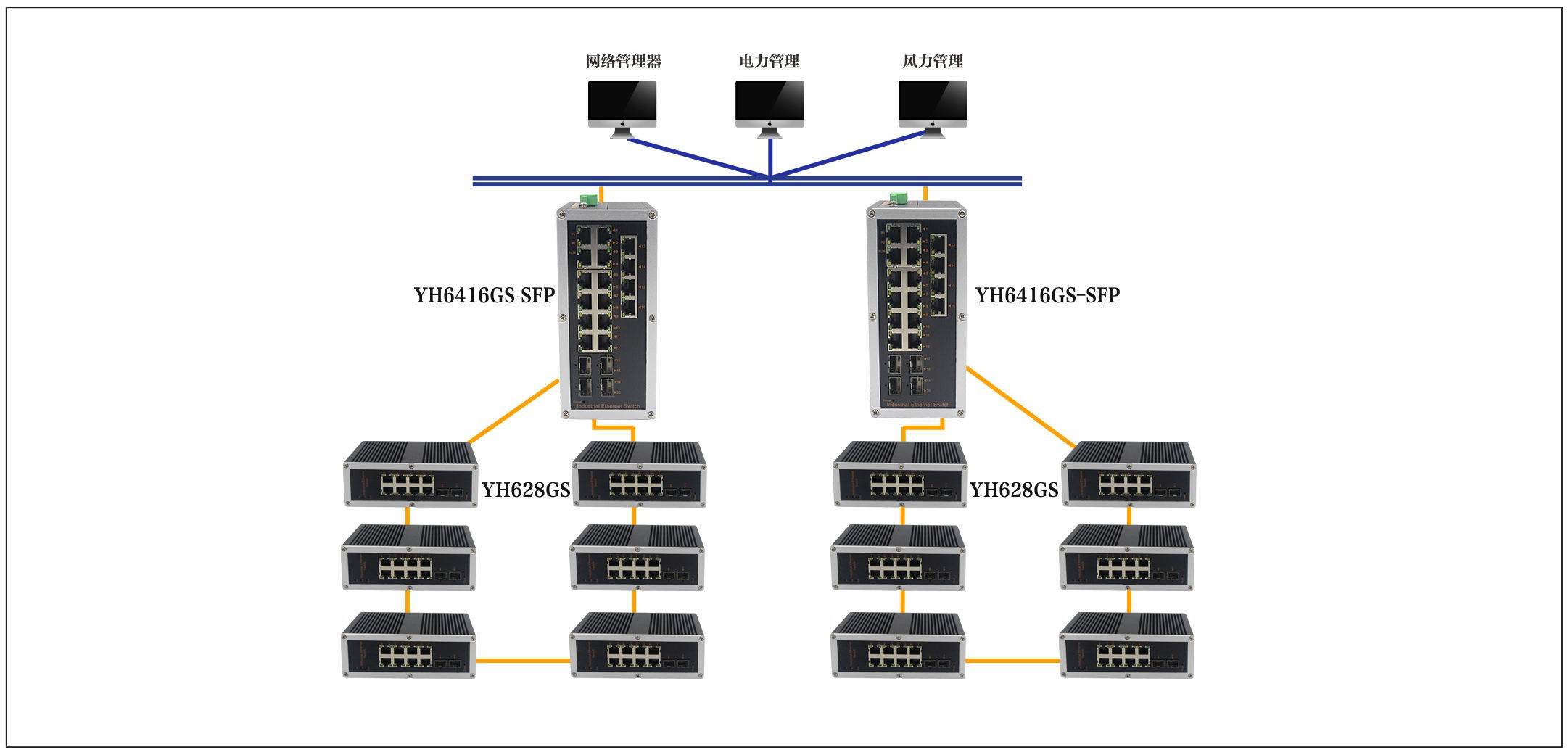 宇航在風力發電站監控系統解決方案中采用YH6416GS-SFP在每個風機的塔筒底部放置工業以太網交換機,環網設備以及核心設備通過1000M光纖互聯核心房安裝倆臺YH628GS組成分別匯聚多個環網數據流量。每個風機由YH628GS工業以太網交換機組成多個千兆環網冗余協議,保障了網絡的無憂切換,提高網絡數據傳輸的高效性。
